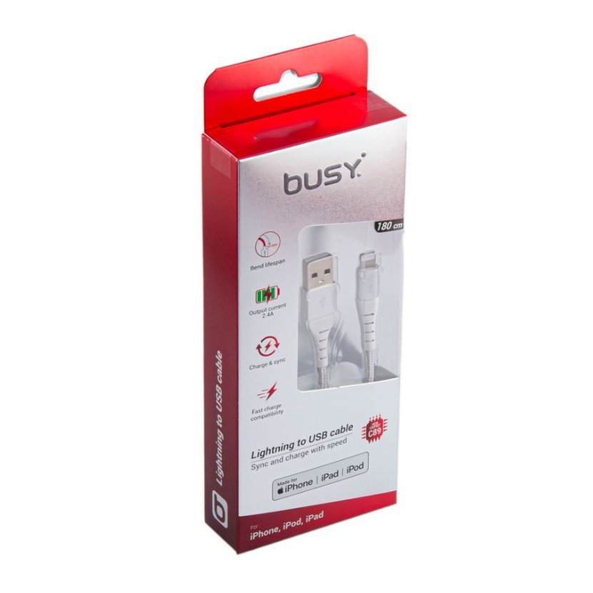 Opletený USB kabel Busy® MFI Certified Lightning 1,8 m je navržen tak, aby poskytoval rychlé a spolehlivé nabíjení a přenos dat pro všechna vaše zařízení Apple s konektorem Lightning. Tento kabel má certifikaci Apple MFI, která zajišťuje bezproblémovou kompatibilitu a nepřerušovaný provoz s iPhone, iPod a iPad. Nylonové opletené pouzdro nabízí výjimečnou odolnost proti poškození a dlouhou životnost. Díky podpoře rychlého nabíjení až 2,4A a rychlosti přenosu dat až 480 Mbit/s je tento 1,8m kabel ideální pro všestranné použití a zvýšený výkon.