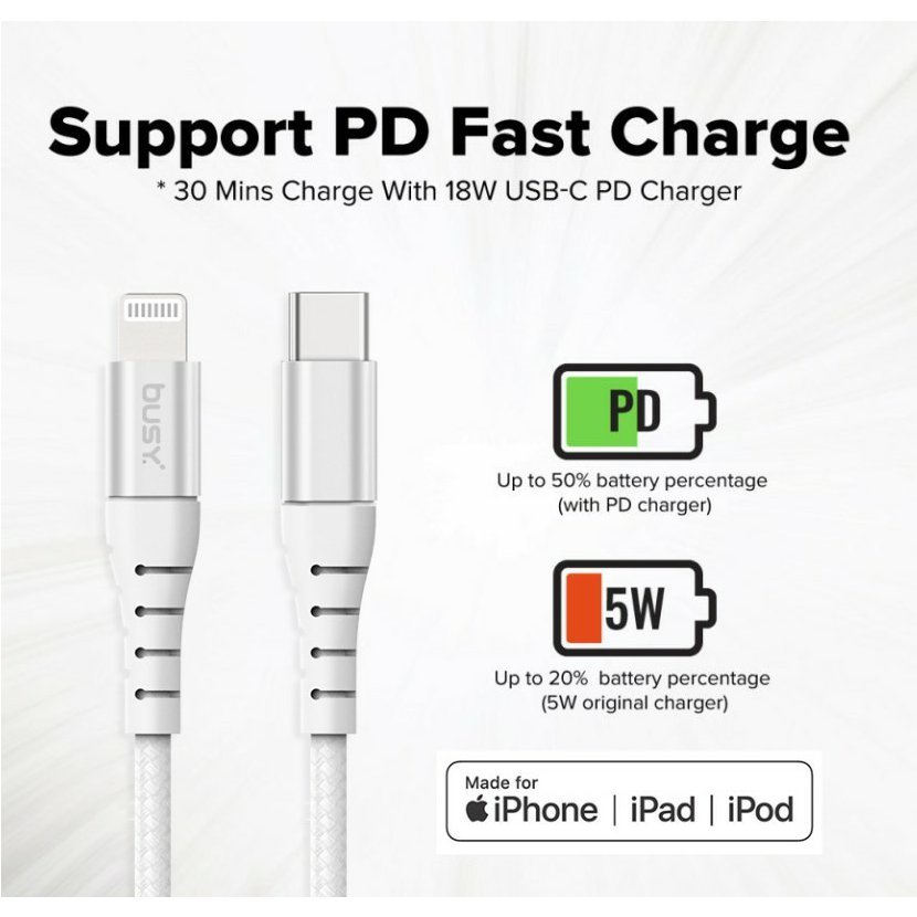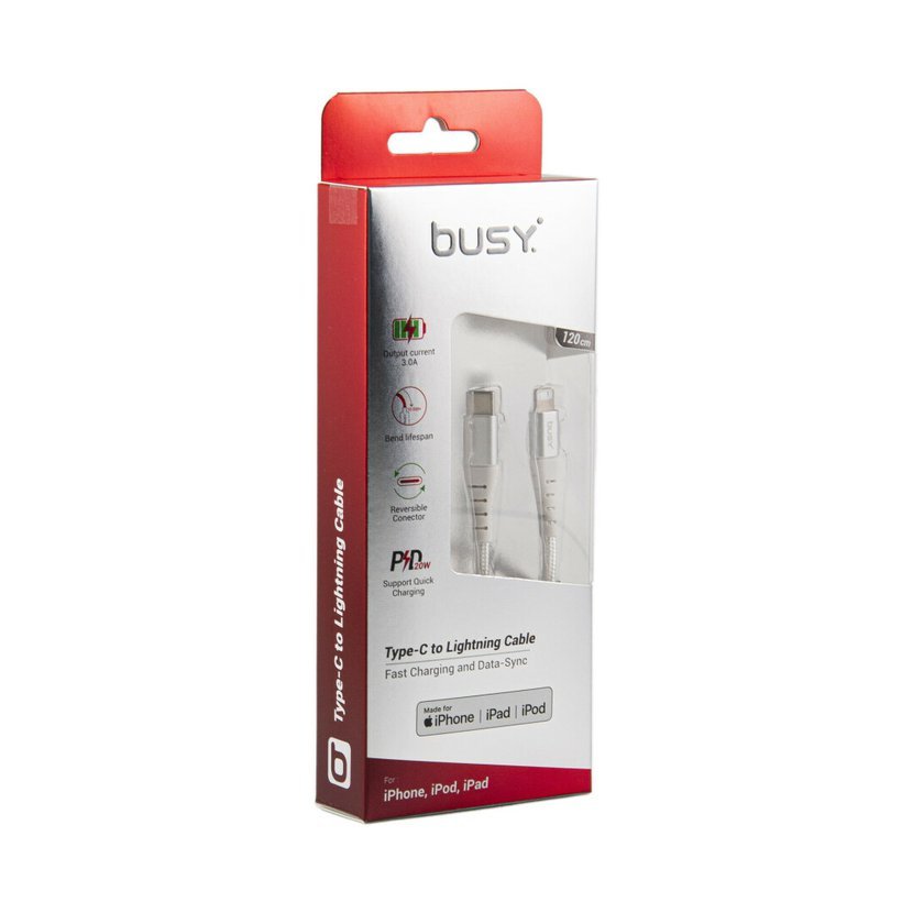 Konektory Type-C a Lightning pro rychlé nabíjení a přenos dat Apple MFI Certified pro zaručenou kompatibilitu a nepřetržitý provoz 18W USB-C PD nabíječka nabije vaše zařízení až na 50 % za 30 minut Prémiový pletený kabel z nylonových vláken pro dlouhou životnost Duraflexibilní konektor pro bezpečné připojení Rychlost přenosu dat až 480 Mbps/s Univerzální kompatibilita s produkty Apple Specifikace: Typ kabelu: Type-C to Lightning Délka: 1,2 metru (120 cm) Napájení: 18W USB-C PD Rychlost přenosu dat: Až 480 Mbps/s Certifikace: Apple MFI Certified Materiál: Prémiové pletené nylonové vlákno Kompatibilita: Univerzální se zařízeními Apple Tipy pro použití: Použijte kabel pro rychlé nabíjení a přenos dat mezi iPhonem a počítačem. Ujistěte se, že vaše zařízení podporují připojení Type-C až Lightning pro optimální výkon. Využijte výhod 18W USB-C PD nabíječky pro rychlé nabíjení. S prémiovým opleteným nylonovým kabelem zacházejte opatrně, aby byla zachována jeho odolnost. Co je v krabici: Kabel Busy® Type-C na Lightning 1,2m Uživatelská příručka